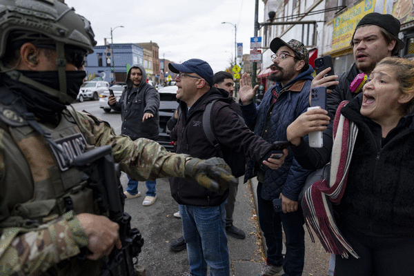 Near the iconic Little Village arch, Bovino — flanked by agents carrying firearms and tear gas — stepped out of his vehicle to face a crowd of outraged community members demanding that the agents leave their neighborhood.