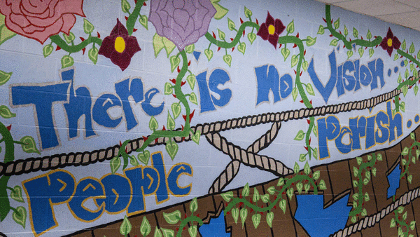 Scrawled across the back wall of the room is a line from Proverbs. “Where there is no vision, the people perish,” it says in blue script.