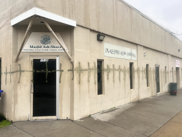 NORFOLK, Va. — The Masjid Ash-Shura mosque on Colley Avenue in Norfolk was vandalized between Sunday night and Monday morning with a series of black crosses spray-painted along the side of the building, but a group of volunteers quickly came together to help clean it off.