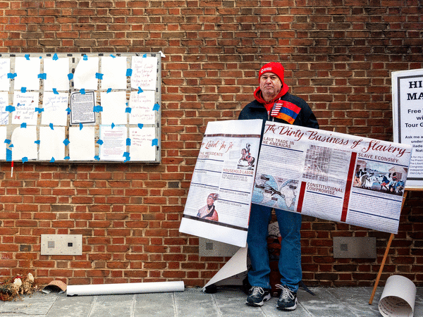 Ted Zellers, a property manager in North Philly, took a more full-body approach to his protest. He found a high-resolution image online of one of the removed signs titled “Slavery in the President’s House,” got it printed twice, fashioned a sandwich board out of the posters, and became “a living sign,” he said.