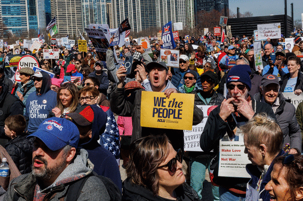 Chicago’s rally kicked off at 1:30 p.m. at Butler Field in Grant Park. In a city that served last fall as ground zero for Trump’s mass deportation campaign, it was expected to highlight “attacks on immigrants and our democracy” as well as opposition to the war in Iran.