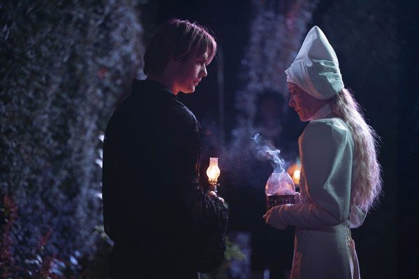 Cherry has one person on her side, Hero (Emma Corrin), her cunning maid, who distracts Manfred from his goal by telling the story of three sisters, who engage in the “sinful, wicked and absolutely forbidden” (for women) pleasure of reading and writing. One of the sisters, Rosa (Charli XCX), is married off to a merchant who soon discovers her “witchcraft.”