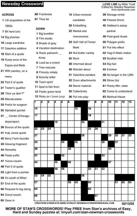 Crossword for 2/13/2026