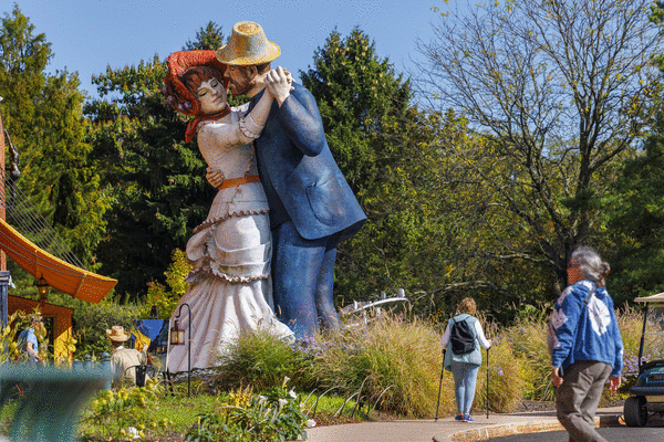 You’re hit with a one-two punch of both types of sculptures at the entrance, where your attention is demanded by a 21-foot-tall version of the twirling, rosy-cheeked couple in Pierre-Auguste Renoir’s Dance at Bougival and diverted from the man on a nearby bench talking to a young child. Your mind assumes the man and child are fellow visitors, until you realize they’re not.