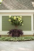 The white blooms of panicle hydrangeas are magical combined with the colorful foliage of Jazz Hands variegated. But this year, almost on a lark, I paired Hollywood Hibiscus Disco Diva. My jaw dropped that first day of hibiscus blooms. The point here is don’t be afraid to try!