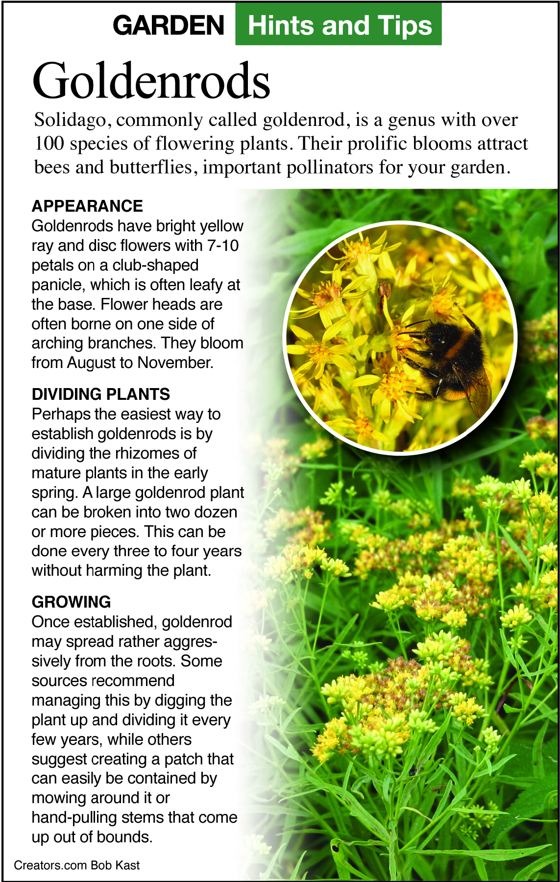 They are late summer and fall bloomers that work well with blue and purple flowering asters. The flower clusters are various shades of yellow, and some are white. They attract many species of pollinating insects with their sticky pollen. They are not wind-pollinated, so they do not contribute to hay fever allergies, as many people believe. They bloom at the same time as ragweed, and these two plants may bloom right next to each other. Ragweed has green flowers and wind-blown pollen. But no one sees the green flowers on ragweed, and so they blame their symptoms on the plant they do see blooming. Watch my videos on goldenrod and ragweed for more information.
