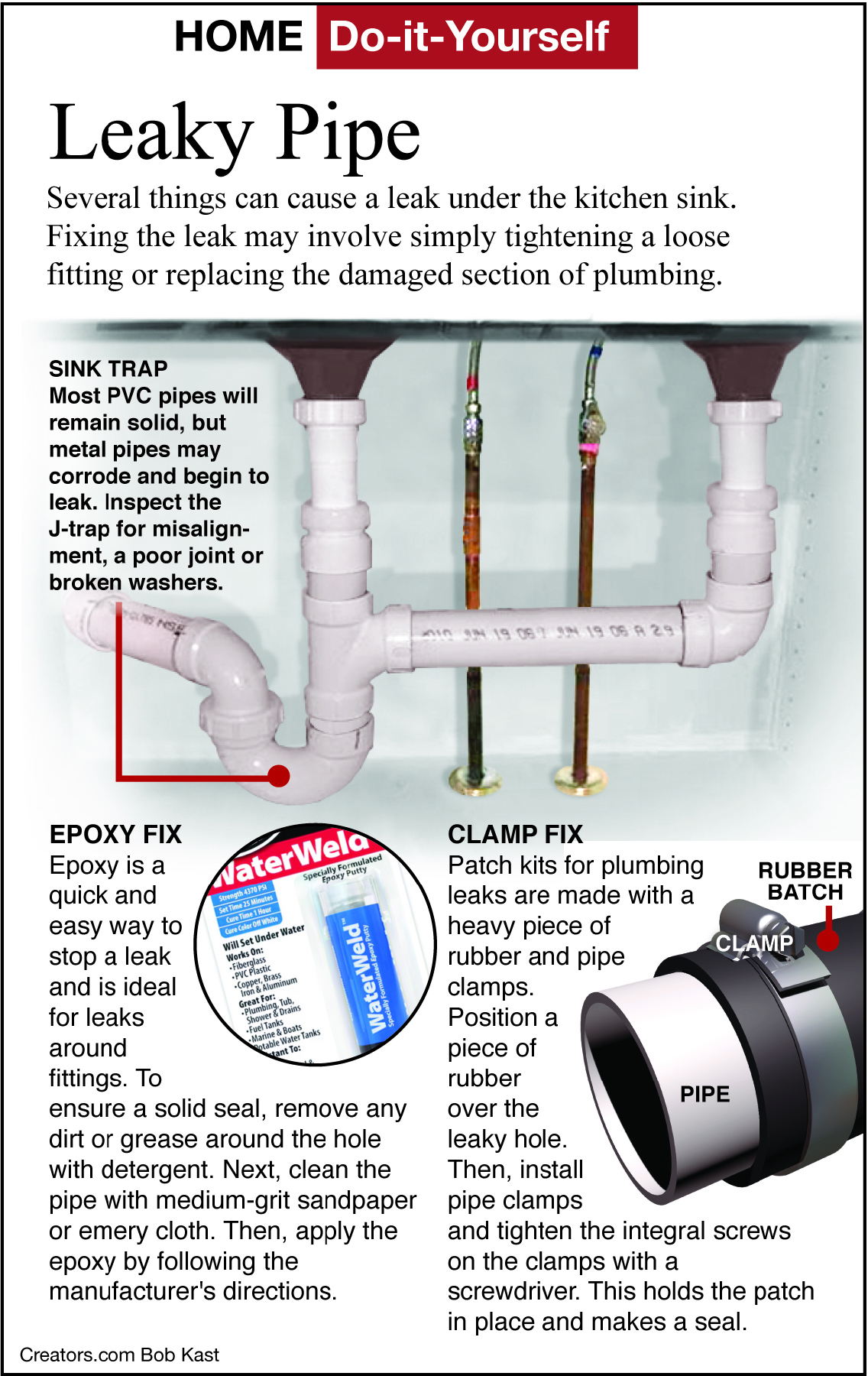 Dear James: I have a very tiny leak in one of the drain pipes directly under the sink. Is there a simple DIY fix for this so I can avoid having to call in a plumber to replace the pipe? -- Miriam F.