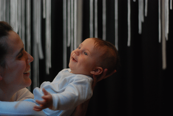“Then we move through the first space, which allows the babies to adjust to some new lights and sounds, and also let the adults have a moment to leave the busy world behind them. There’s a big net overhead that has little soft strings hanging down from it, evoking rain. And then from there we move into the main space, which is where the cellist is, so we start to hear some beautiful cello music. There’s a big white rug and overhead there are pieces that hang down and look like raindrops. There is space for families to sit down on the rug as the performers move through the cycle of a rainstorm, and the performers are interacting with the babies and the elements of the installation while they’re doing that. And then afterwards, families are free to explore the space with their little one. The performers are still around, the cello is still playing. There are some mirrored puddles on the ground, for example, that babies love to look into, and other elements they can interact with.”