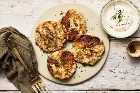 Whip up these mashed potato pancakes anytime you have leftover mashed potatoes on hand. Sharp cheddar cheese and chives are the perfect pairing with potatoes, and the tangy sour cream ties it all together.