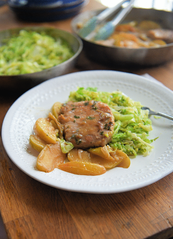 Transfer chops to a platter or divide among 4 plates. Top with apples and sauce, and serve with warm cabbage slaw.