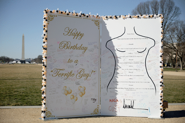 Nearly 500 people have stopped to sign a giant replica of the birthday card President Donald Trump gave to the convicted sex trafficker Jeffrey Epstein for his 50th birthday. The clandestine arts activism group Secret Handshake erected the pop-up monument Monday on the National Mall in Washington, D.C.