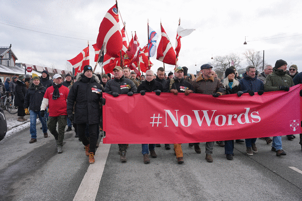 The demonstration started at the memorial for Danish troops who lost their lives in recent wars, where veterans laid a wreath and held one minute of silence. The protesters then walked in sub-zero temperatures about one mile across the Danish capital to the U.S. embassy, carrying Danish flags and banners saying NoWords, the official name of the protest.