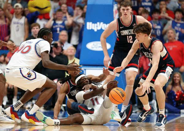 Ball pushed the lead to six from beyond the arc with five and a half minutes to play and the contingent of UConn fans and families made themselves heard from the corner of the historic arena. Kansas certainly wasn’t going down quietly in its home cathedral. Bidunga slammed in a dunk and Melvin Council Jr. nailed a 3-pointer to cut the Jayhawks’ deficit to one and burst some ear drums.
