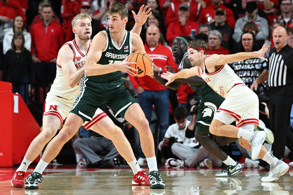 Nebraska took a slim lead as turnovers and fouls continued to muddle Michigan State’s offense. A 3 from Nebraska sharpshooter Pryce Sandfort over the late hand of Trey Fort was the difference as the Cornhuskers held a 41-38 lead with 11:33 minutes to go.