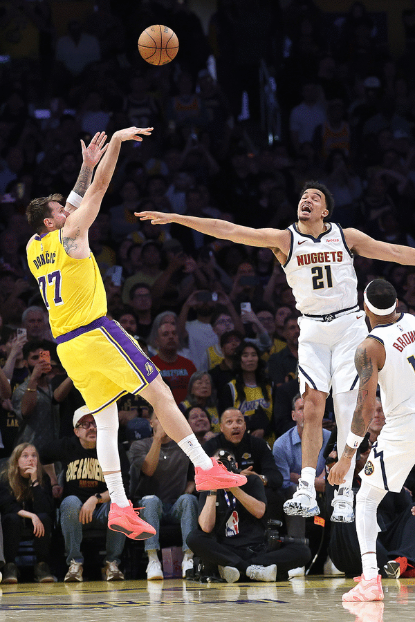 Then it was Doncic in Los Angeles, setting an off-ball screen for Rui Hachimura and getting Jones switched onto him Saturday. The Lakers cleared out the left side of the floor, taking Christian Braun out of the play. Jones was still aided up top by Bruce Brown, the nearest help defender. Behind him, Aaron Gordon was rotating to Austin Reaves to protect against the easiest pass Doncic could make out of a double-team.