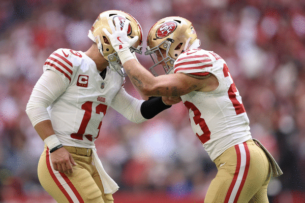 Purdy had a perfect 158.3 passer rating thorugh the first period, and he pumped the lead to 19-7 with a 9-yard touchdown pass to McCaffrey, who found himself wide open thanks to Kittle’s open-field contact with linebacker Cody Simon.